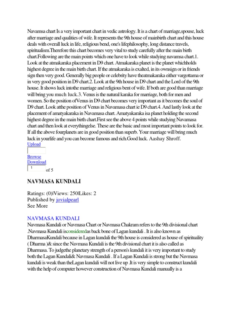 Ultimate Guide To Reading Navamsa Chart (D9 Chart ... When reading the Navamsa Chart, one should first take the D9 chart and D1 Chart (Birth Chart) and place them on the table side by side. One should go back and forth between the charts checking the positions of each planet in the D1 and D9 charts. Next one should analyze the D1 Chart (Birth Chart) and check the strength and position of each planet. How To Read Navamsa Chart For Career | VetFedJobs.org Navamsa is a Divisional Chart which is very important to see in Vedic Astrology. ... Meaning of Navamsa is '' Nine Amsa'' and Amsa means division. So Navamsa simply means 9th Division of a Sign. The Navamsa chart decides the strength of planets in your horoscope. Which horai is good for applying job?