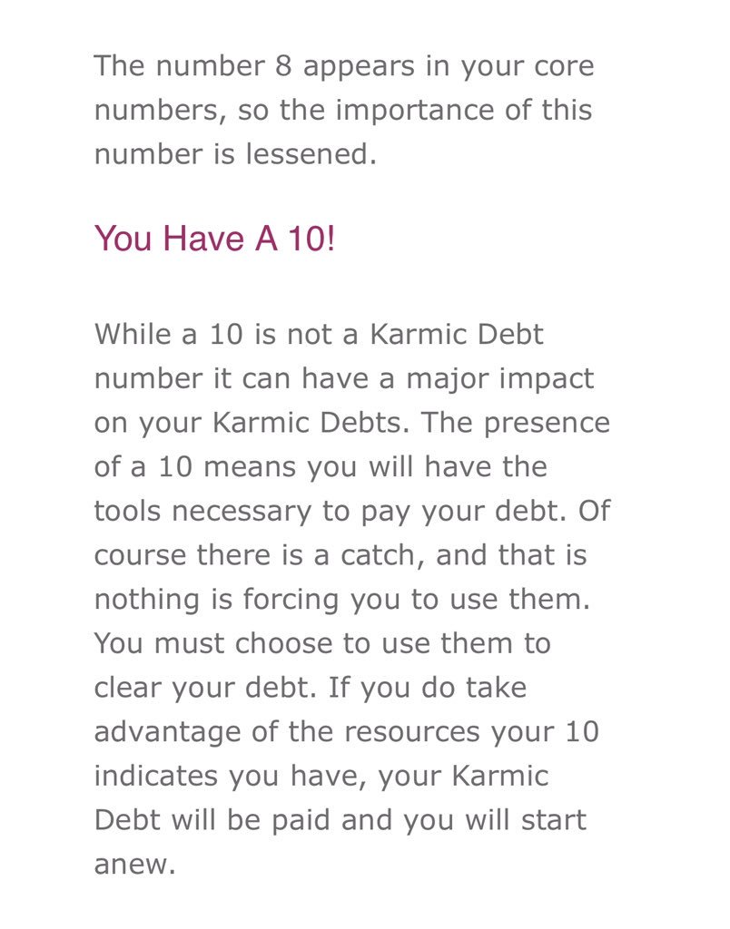 cafeastrology.com-You By Your Numbers Report (1).pdf - You... A 13 Karmic Debt Number implies that somewhere along your being's path you forsook your spiritual self for material gain. You may have abused others to get ahead in the past or in a past life. Because of your past behavior you may find yourself facing what appears to be one 6/7brick wall after another as you try to find success.