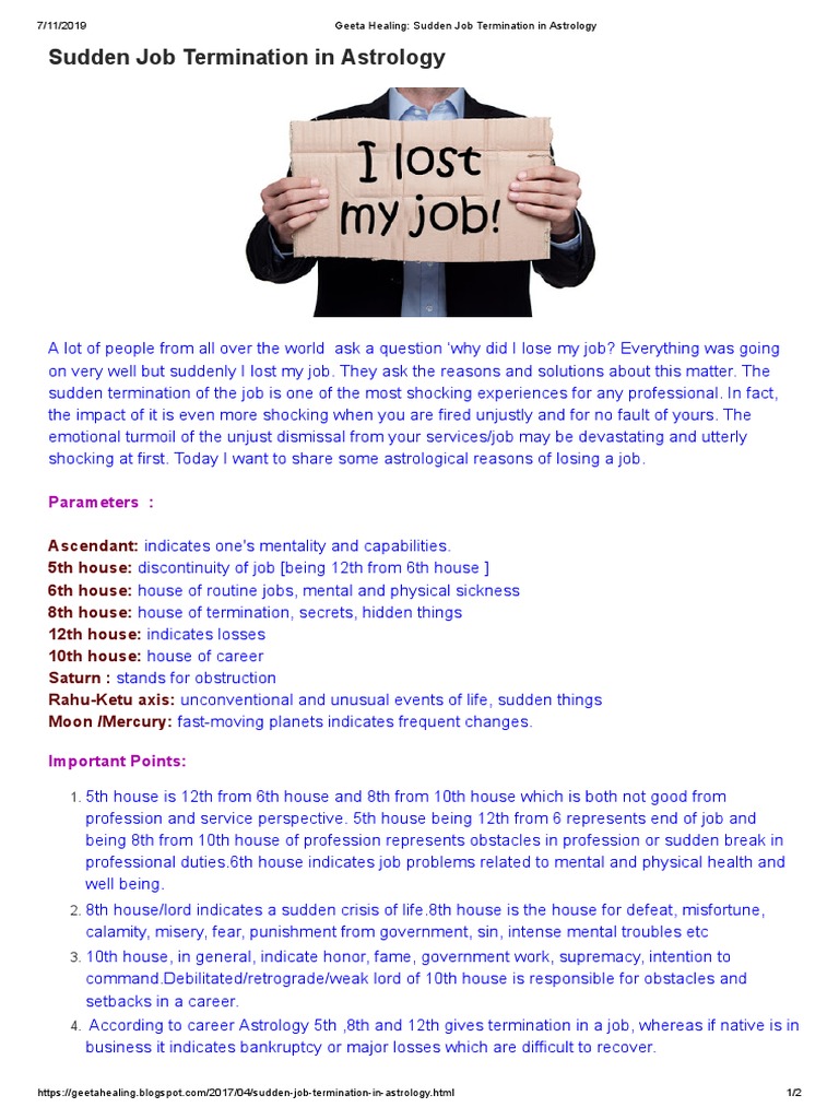 Geeta Healing: Sudden Job Termination in Astrology - Blogger The sudden termination of the job is one of the most shocking experiences for any professional. In fact, the impact of it is even more shocking when you are fired unjustly and for no fault of yours. The emotional turmoil of the unjust dismissal from your services/job may be devastating and utterly shocking at first.