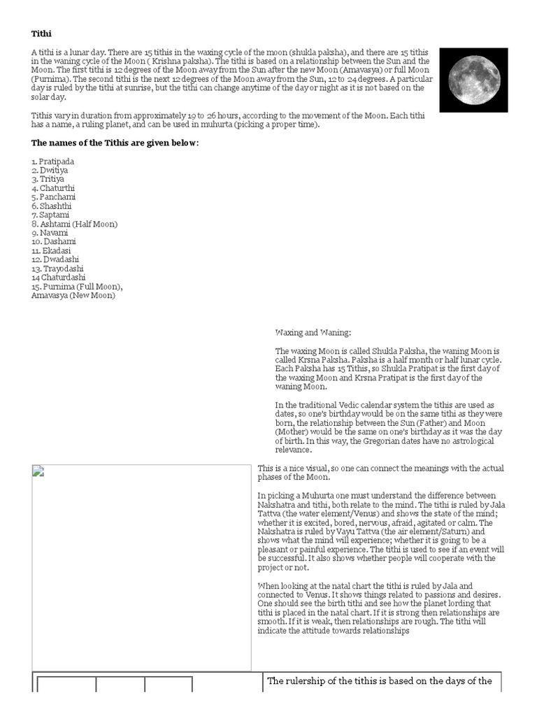 Today Panchang November 17, 2022: Tithi Shubh Muhurat, Rahu Kaal ... Karan: There are two Karanas on Tithi. In the first part of a date and in the latter part of a date. There are a total of 11 Karanas whose names are as follows - Bava, Balava, Kaulava, Taitil, Gar, Vanij, Vishati, Shakuni, Chatushpad, Nag, and Kistaghan. Vishti Karan is called Bhadra and auspicious work is considered forbidden in Bhadra. Tithis - Freedom Vidya A tithi is a lunar day. There are 15 tithis in the waxing cycle of the moon (shukla paksha), and there are 15 tithis in the waning cycle of the Moon ( Krishna paksha). The tithi is based on a relationship between the Sun and the Moon. The first tithi is 12 degrees of the Moon away from the Sun after the new Moon (Amavasya) or full Moon (Purnima).
